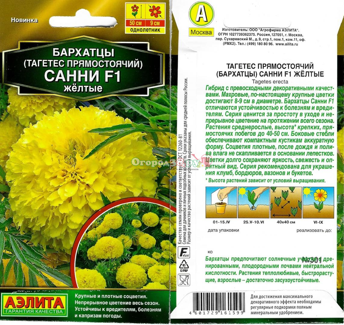 Бархатцы Санни F1 желтые прямостоячие 10шт 50см
